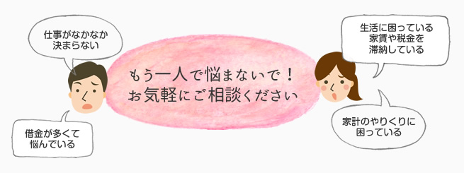 | こんな支援を行います | ●相談支援員が、お話をお聞きいたします。必要なサービス等をご案内します。 ●相談の内容により、継続的な支援が必要であると判断した場合は、 あなたに沿った支援プランを作成します。 ●支援プランは、自立生活に向けた就労支援や各種サービスの提供を計画するもので、このプランに基づき、支援を行っていきます。 |